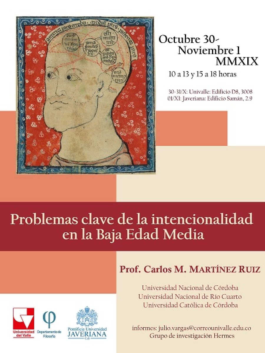 El Grupo Hermes del Departamento de Filosofía de la Universidad del Valle invita al Seminario intensivo sobre la "Intencionalidad en la baja Edad Media", el 30 y 31 de octubre, en el Edificio D8 salón 3008 de la Facultad de Humanidades de Univalle, y el 1 de noviembre en el Edificio Samán, 2.9 de la Universidad Pontifica Javeriana de Cali, entre las 10:00 a.m y las 6:00 p.m.