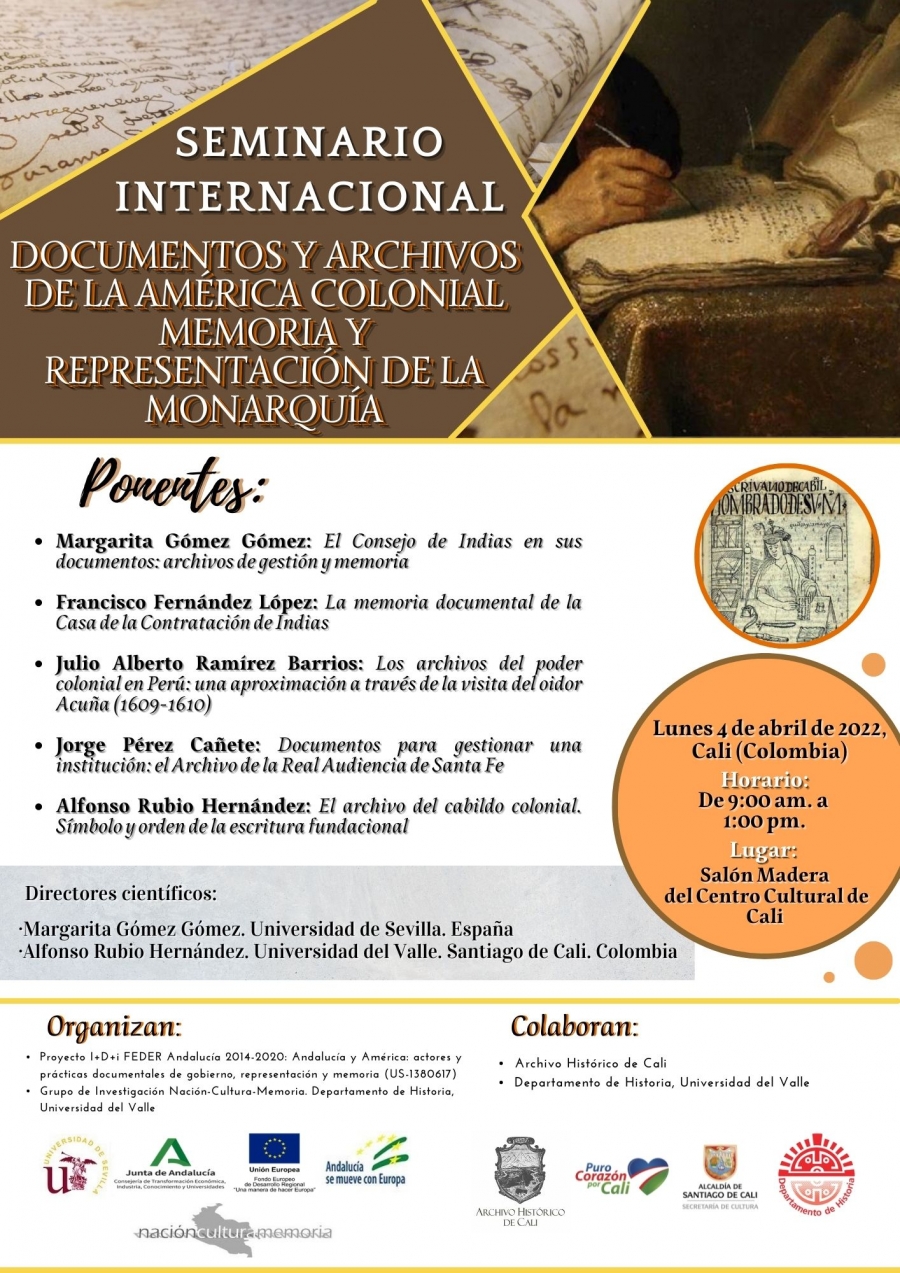 El Departamento de Historia de la Universidad del Valle, a través de su Grupo de Investigación Nación-Cultura-Memoria y el Proyecto I+D+i FEDER Andalucía 2014-2020 -Andalucía y América: actores y prácticas documentales de gobierno, representación y memoria (US-1380617)- invitan a toda la comunidad al seminario internacional Documentación y archivos de la América colonial: memoria y representación de la monarquía. El encuentro será en el Salón Madera del Centro cultural de Cali el próximo lunes 4 de abril de 9 am a 1 pm.