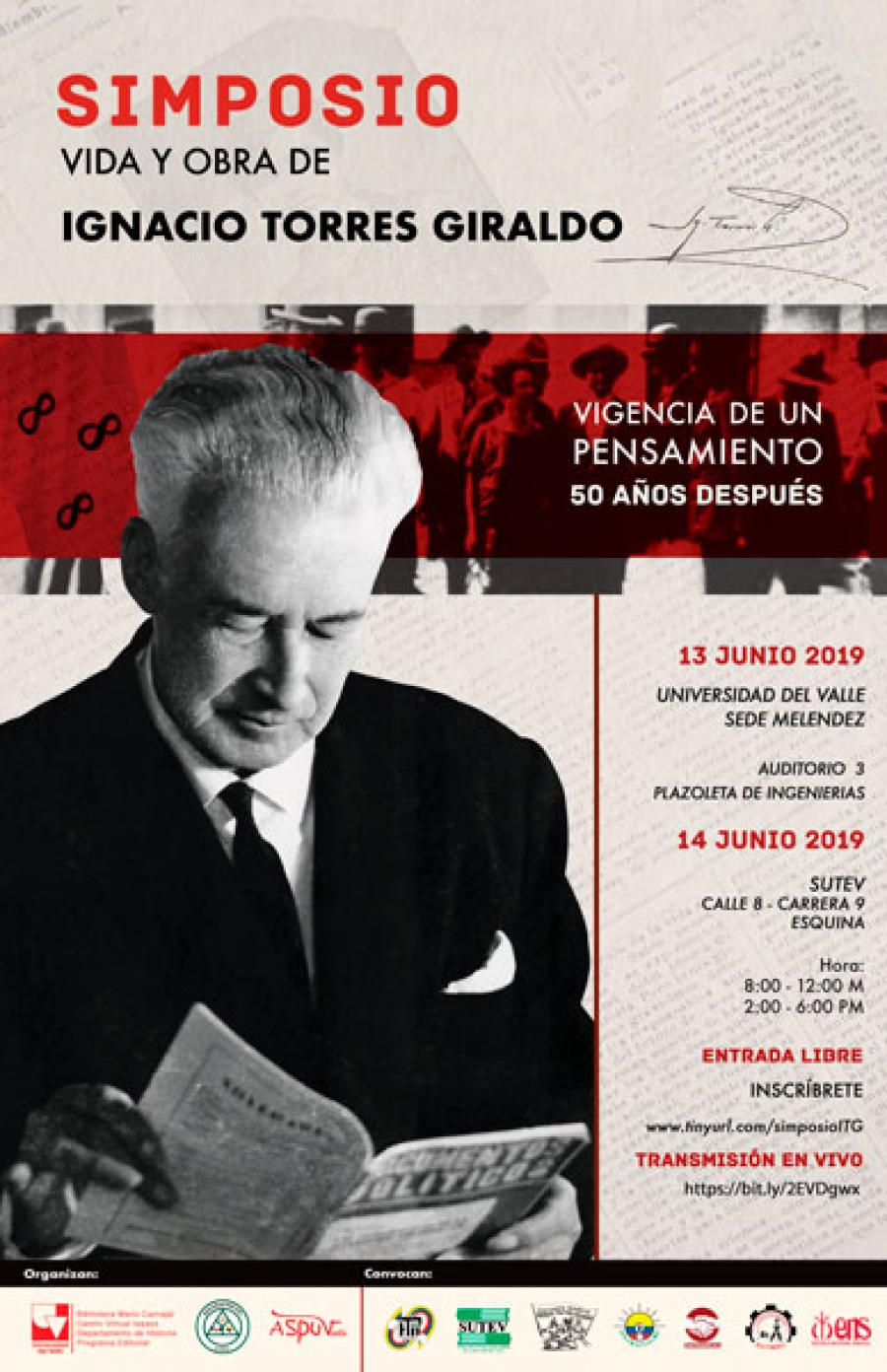 La Facultad de Humanidades de la Universidad del Valle invita al "Simposio: Vida y Obra de Ignacio Torres Giraldo", que se realizará los días 13 y 14 de junio de 2019 en Cali, con el propósito de exaltar el valor histórico y social de la vida y obra del líder sindical, así como de sus compañeros y también destacados líderes: María Cano, Quintín Lame y Raúl Eduardo Mahecha, entre otros.