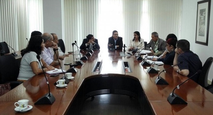 El rector de la Universidad del Valle Édgar Varela Barrios, la vicerrectora académica Liliana Arias Castillo, el secretario general Luis Carlos Castillo Gómez y el director de la Oficina Jurídica Néstor Hugo Millán Mendoza se reunieron con profesores del Departamento de Historia y conversaron sobre los conflictos internos que recientemente se han presentado en esta unidad académica.