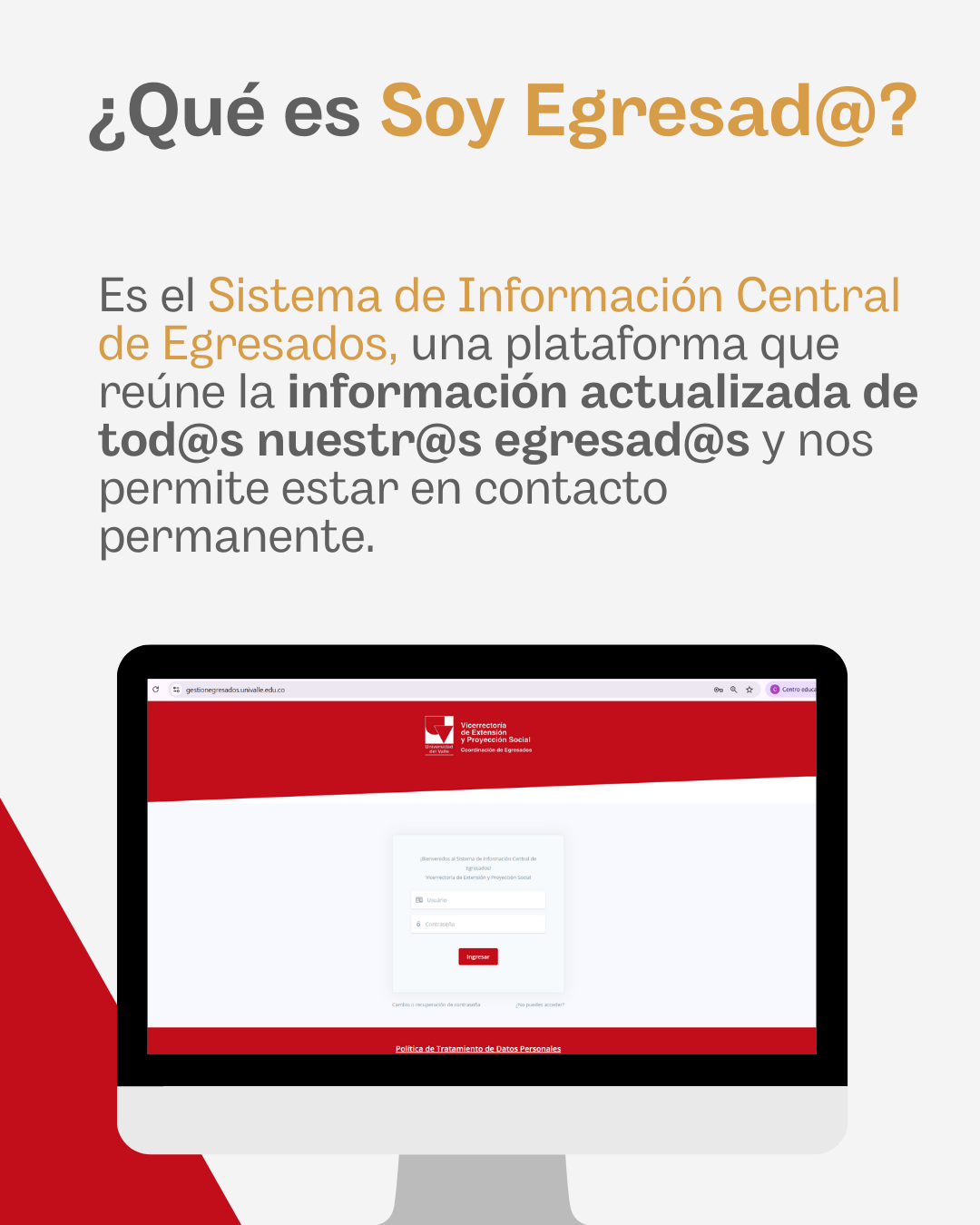 Es la plataforma que integra el Sistema de Información Central de Egresados, una herramienta institucional que permite a los/as egresados/as de la Universidad del Valle registrar y actualizar su información personal, académica y laboral, contribuyendo a una comunicación más cercana y efectiva entre la Universidad y su comunidad de graduados.
