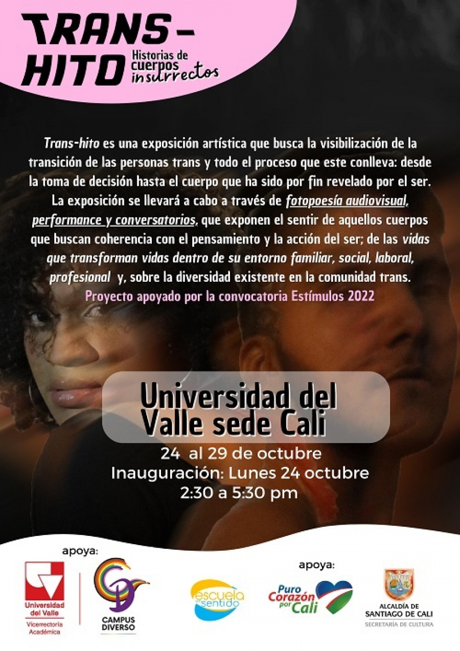 El Programa Campus Diverso de la Vicerrectoría Académica de Univalle, en articulación con Escuela con Sentido, la Secretaría de Cultura de la Alcaldía de Santiago de Cali y la Secretaría de Mujer, Equidad de Género y Diversidad Sexual, se invita a la comunidad universitaria al evento artístico de impacto social "Trans-hito: historias de cuerpos insurrectos".