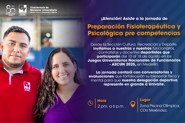 Invitamos a toda nuestra delegación deportiva univalluna de funcionarios, docentes y contratistas, a participar de esta jornada como una oportunidad de bienestar para fortalecer cuerpo y mente, para que de quienes defienden con orgullo nuestros colores en cada escenario deportivo, nos representen con excelencia en los Juegos Universitarios Nacionales de Funcionarios ASCUN 2025. ¡Las y los esperamos en la Jornada de Preparación Fisioterapéutica y Psicológica Pre competencias!