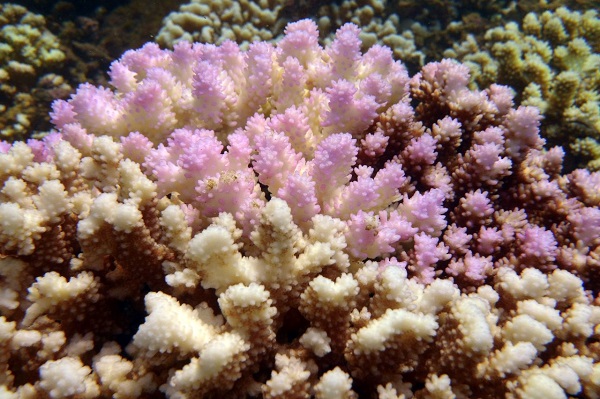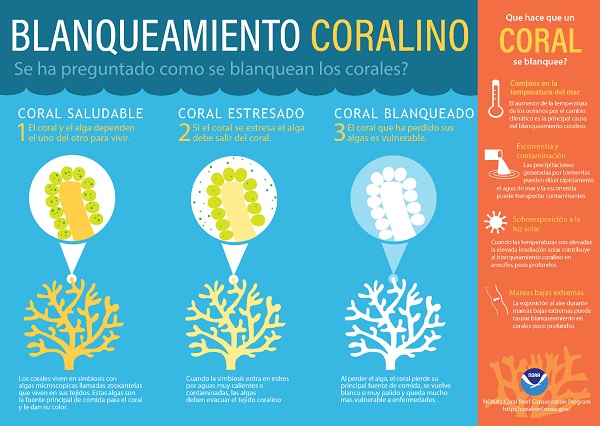 Los corales son animales marinos conformados por pequeños pólipos (similares a pequeñas anémonas) que forman colonias y viven fijos al fondo del mar en hermosos esqueletos minerales construidos por ellos mismos. Los corales deben sus variados colores y gran parte de la energía que necesitan para vivir a miles de algas microscópicas que viven dentro de sus pólipos. Cuando el agua de mar se calienta más de lo normal por prolongados periodos de tiempo, se vuelve imposible para el coral mantener a estas algas en su interior. Como un último intento por sobrevivir al estresante calor, los corales expulsan sus algas a un gran costo. Aunque los corales pueden sobrevivir a esta pérdida por algún tiempo, quedan vulnerables a morir de hambre. Al perder sus coloridas algas, los corales pierden también su color y sus pólipos translúcidos dejan ver los blancos esqueletos coralinos. Aunque los arrecifes blanqueados podrían dar la impresión de brillo y belleza, están en grave peligro de morir y eventualmente degradarse hasta desaparecer.