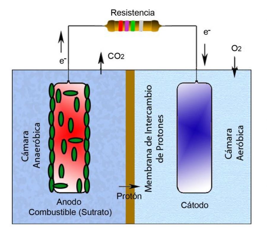 El sistema que se utiliza para esta conversión de energía química en eléctrica, denominado celda de combustible microbiana, tiene un colector de corriente de metal o carbono sobre el cual se aglomeran las bacterias forman una biopelícula que descarga electrones.