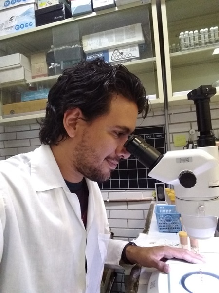 Oscar Tabares observando a través de un microscopio estereoscópico.
