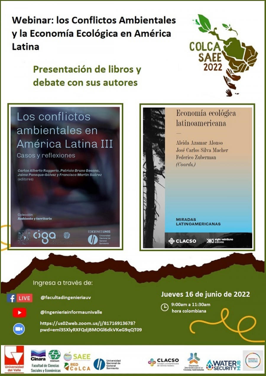 El IV Congreso Latinoamericano de Conflictos Ambientales (COLCA IV) y el III Congreso de la Sociedad Andina de Economía Ecológica (SAEE) que se realizarán entre el 24 y 28 de octubre de 2022 en la Universidad del Valle Sede Cali, Colombia los invita a participar en el Segundo Webinar Pre COLCA-SAEE 2022.