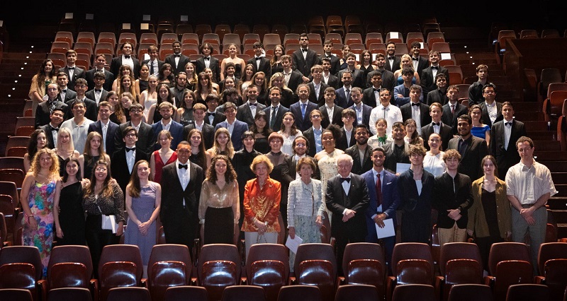 En la segunda fila, de traje blanco y toques dorados, Marlin Yuranny posa junto a los demás galardonados durante la velada. En el centro, de naranja, la Reina Doña Sofía de España. Foto tomada del facebook de la Escuela Superior de Música Reina Sofía