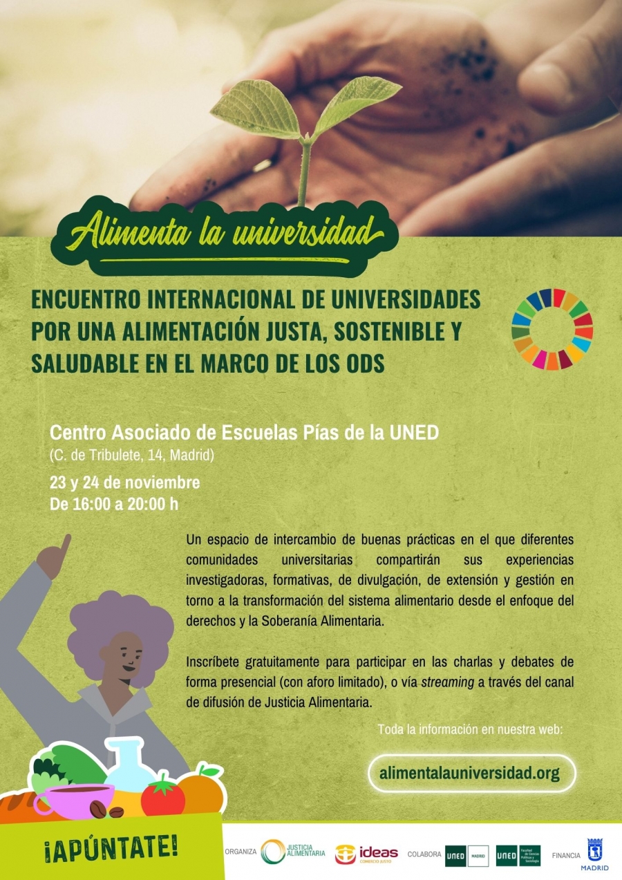 Este encuentro internacional tiene como objeto la reflexión y el intercambio de experiencias entre comunidades universitarias que promueven la transición hacia un modelo de alimentación justa, sostenible y saludable, para abordarlo con la ciudadanía, como una forma de promoción del derecho a la alimentación y la Soberanía Alimentaria
