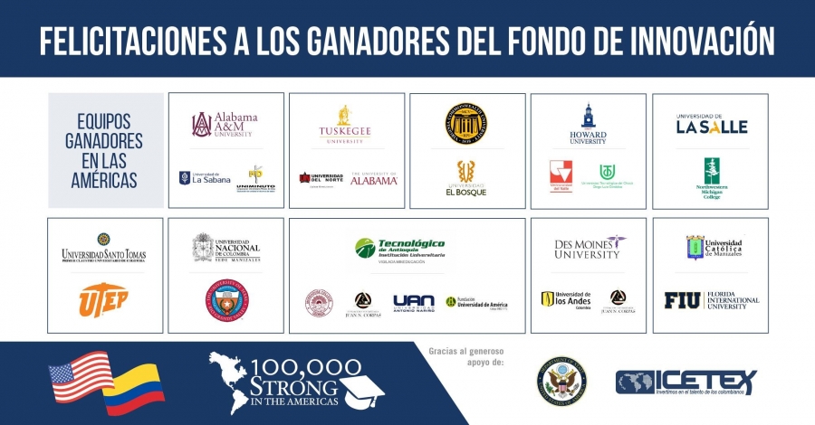 El Fondo de Innovación 100k es organizado por la Embajada de los Estados Unidos en Colombia, la Oficina de Asuntos del Hemisferio Occidental del Departamento de Estado en Estados Unidos y Partners of the Americas; con apoyo del ICETEX.