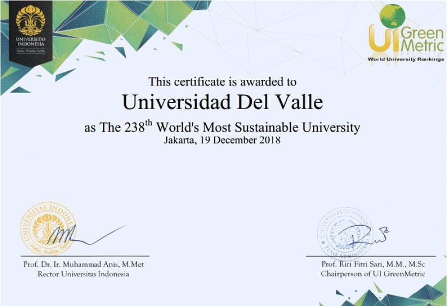 El pasado mes de Diciembre 2018 se publicaron los resultados del 'Índice internacional UI Greenmetric' en el cual participa la Universidad del Valle desde el año 2016. Para la Universidad este índice tiene singular importancia dado que es uno de los indicadores de resultado del Plan Programático 2017-2020, localizado en el Programa Campus Sostenible.