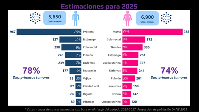 De acuerdo con las estimaciones del RPCC, para 2025 se registraron cerca de 12.550 nuevos casos de cáncer en Cali. Los tipos más frecuentes continúan siendo el cáncer de mama en mujeres y el cáncer de próstata en hombres, seguidos por cáncer de estómago, colorrectal y linfomas en ambos sexos. A estas cifras se suman alrededor de 2.900 muertes registradas por esta causa, con el apoyo de la Secretaría de Salud Distrital.