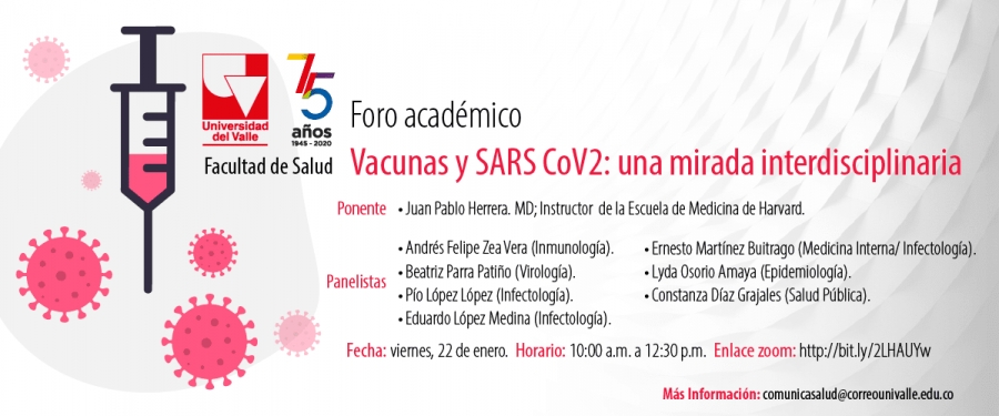El objetivo del Foro es ofrecer un panorama actualizado sobre las características de las vacunas en uso contra el SARS CoV2, desde una mirada interdisciplinaria. Para esto se contará con docentes de inmunología, infectología, virología, medicina interna, salud pública y epidemiología, de la Universidad del Valle como también del Dr. Juan Pablo Herrera, Instructor de la Escuela de Medicina de Harvard (USA).