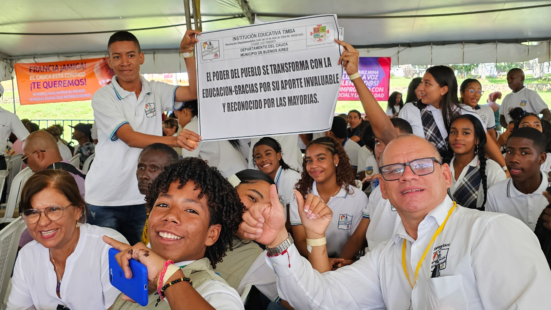 Detrás de él, una guardia indígena levanta el bastón de mando al iniciar el acto, más atrás adultos, abuelitos y niños celebran, lloran, sonríen a las cámaras. Las maestras y maestros siguen buscando periodistas, han oído que se buscan estudiantes recién admitidos para una foto con el presidente. “Él se acaba de graduar”, dice una profe.