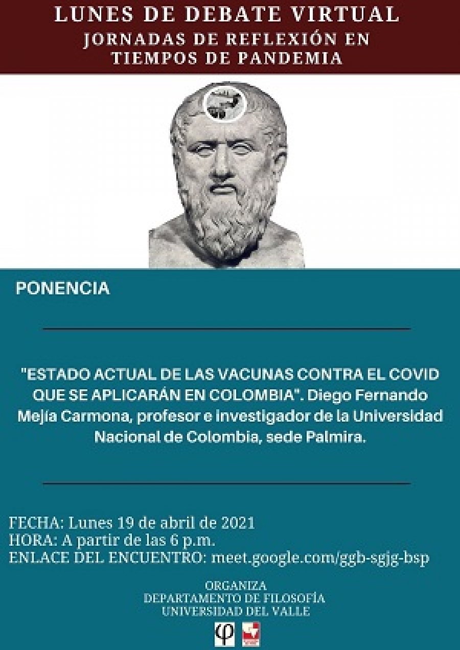 El Departamento de Filosofía de la Universidad del Valle invita a ‘Lunes de debate’, este 19 de abril, con la ponencia: “Estado actual de las vacunas contra el Covid que se aplicarán en Colombia”, por Diego Fernando Mejía Carmona, profesor investigador de la Universidad Nacional de Colombia, sede Palmira.