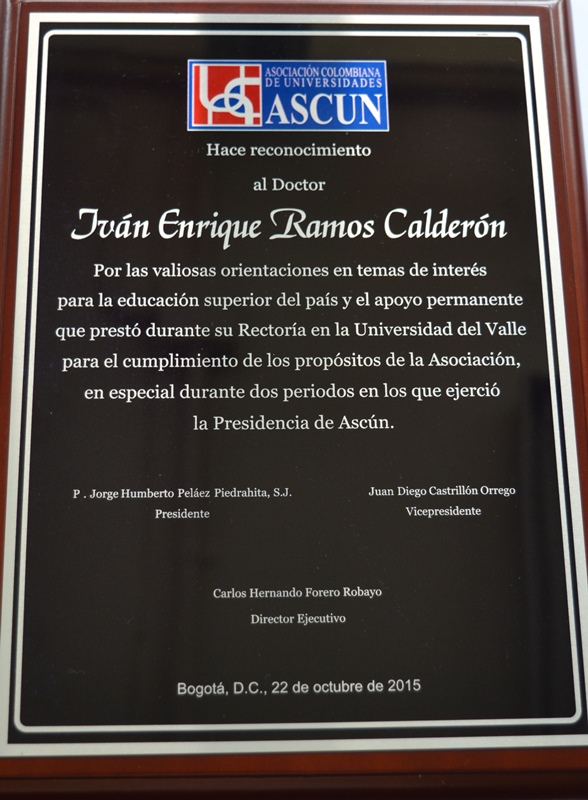 La Asociación Colombiana de Universidades-ASCUN hizo un reconocimiento al rector de la Universidad del Valle, Iván Enrique Ramos Calderón, “por las valiosas orientaciones en temas de interés para educación superior del país y el apoyo permanente que prestó durante su Rectoría en la Universidad del Valle para el cumplimiento de los propósitos de la Asociación, en especial durante los dos periodos en los que ejerció la Presidencia de Ascún”.