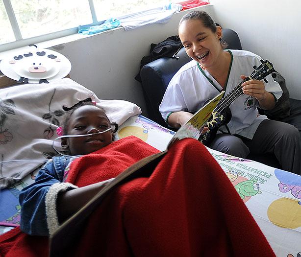 Pero no solo leen cuentos. Marielly Soto tiene 24 años y hace poco se vinculó al programa ‘Palabras que acompañan’, el mismo del que hace parte Mary Luz. A Marielly le gusta llevar una guitarra o a veces una bandola, de las que deja salir una serie de melodías que acompañan su voz, la de los niños y hasta la de los papás, quienes terminan unidos en un coro alegre en la mitad de los fríos consultorios clínicos.