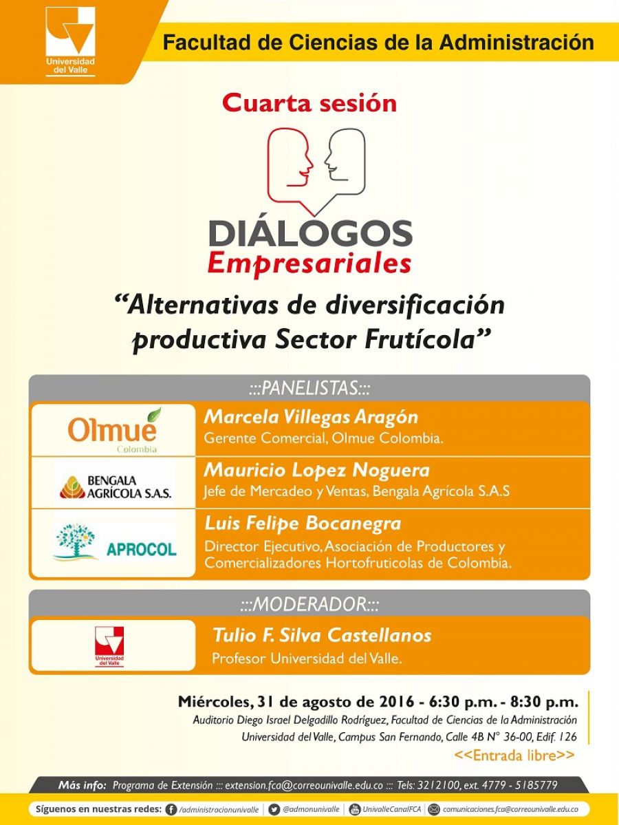 La diversificación productiva y el sector frutícola del Valle del Cauca es el tema que de la IV sesión de los Diálogos Empresariales, que se realizará este miércoles 31 de agosto, a las 6:30 p.m. en el Auditorio Diego Israel Delgadillo de la Universidad del Valle, Campus San Fernando.