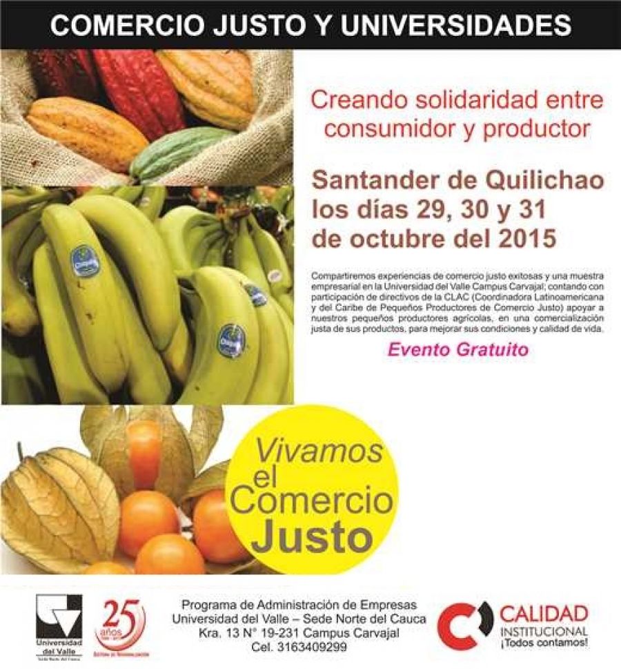 Hoy, jueves 29 de octubre de 2015, inicia el Encuentro Universidades y Comercio Justo, organizado por la Universidad del Valle, Sede Norte del Cauca, y termina el 31 de octubre del 2015 en el Campus Carvajal en Santander de Quilichao.